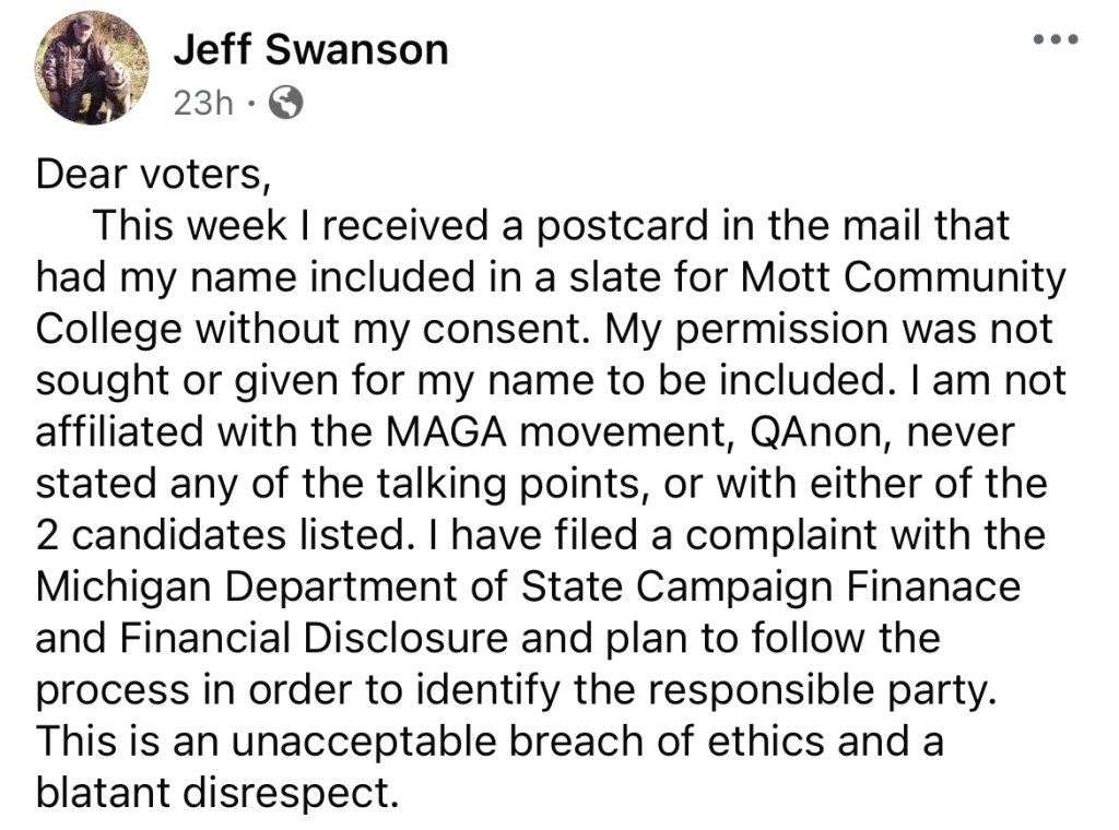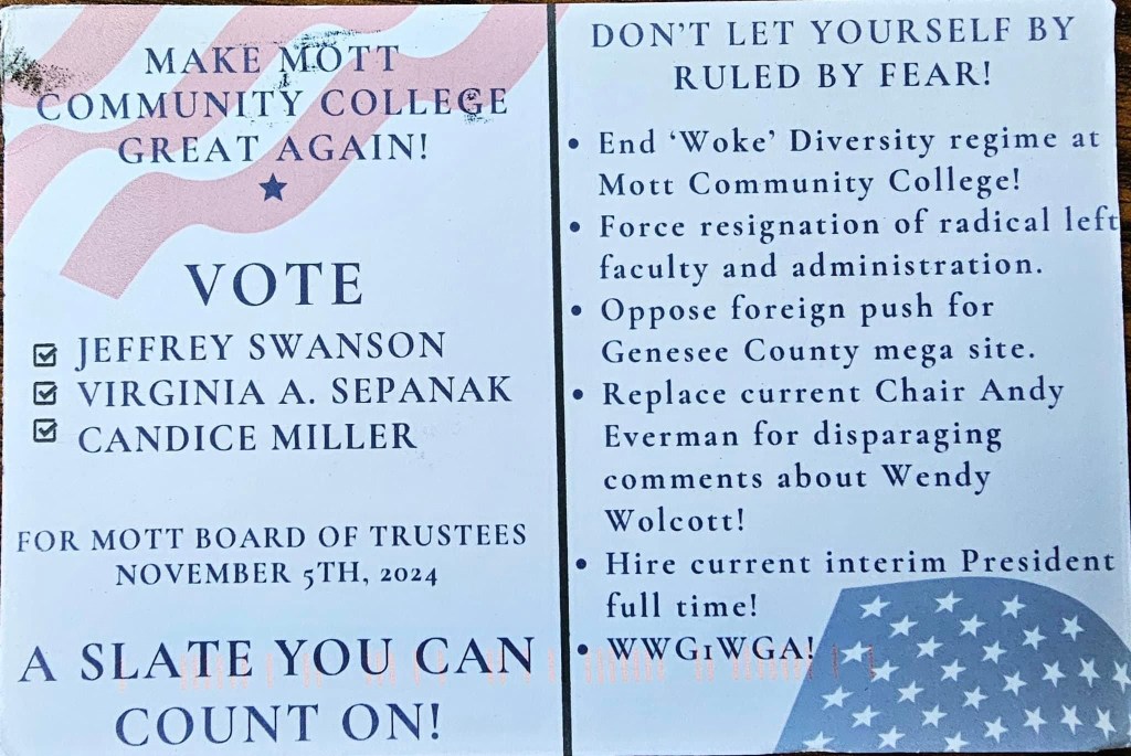 UPDATE (10-9-2024): In the comments of a Facebook post by Mott Trustee Michael Freeman about the mailer, Wolcott says that she and Swanson were unaware the mailer was going out and they did not give their consent to being mentioned on it.