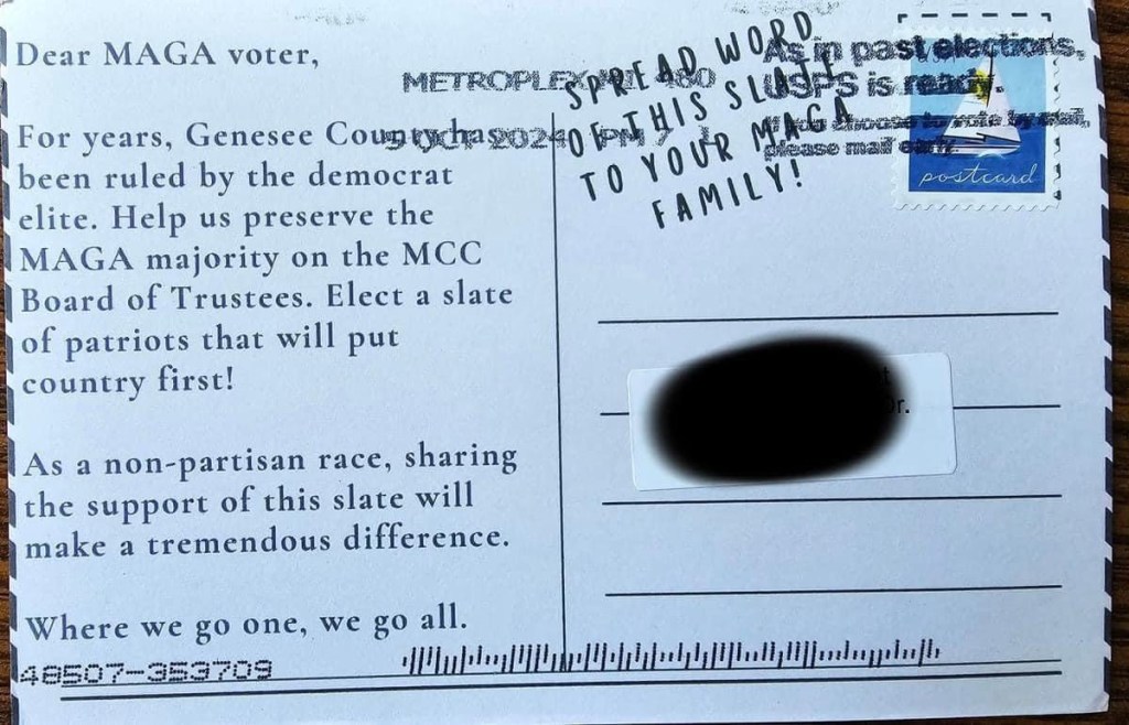 A month ago, I wrote a lengthy post tying together all of the ultra right wing and Qanon-adjacent connections of five current Mott Community College board members and their hand-selected interim president. Little did I know, just a short time later, they’d pull all of those connections together for me on a handy, unhinged postcard that was apparently mailed to some Genesee County residents.
