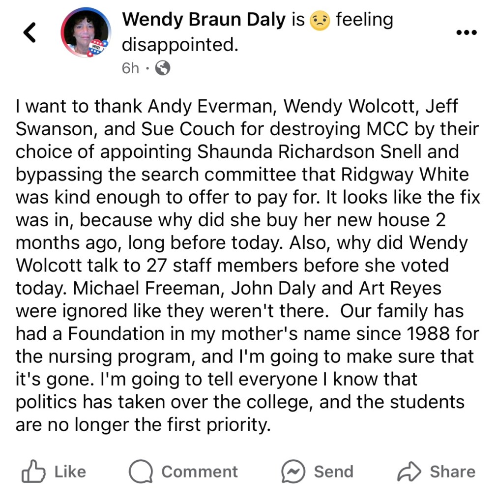 • In a Facebook post after last night’s meeting, Daly’s wife said so as well, writing: “It looks like the fix was in, because why did she (Richardson-Snell) buy her new house two months ago, long before today? Also, why did Wendy Wolcott talk to 27 staff members before she voted today?” Here’s her full comment:
